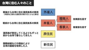 「台湾語」にルーツを持つ人は「閩南人」、「客家語」の場合は「客家人」、「台湾原住民族」この日本統治時代以前から住んでいる3種類の人たちは「本省人」と呼び